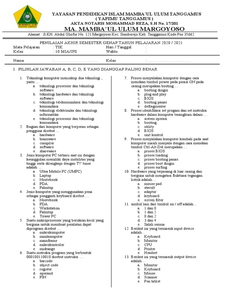 Contoh Soal TIK Kelas 10 Semester 2 Beserta Pembahasannya