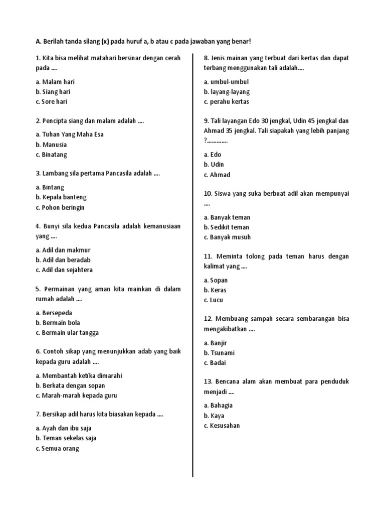 - PPKn: 2-3 item (isian tentang nilai moral, perilaku baik/buruk).
